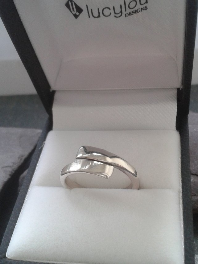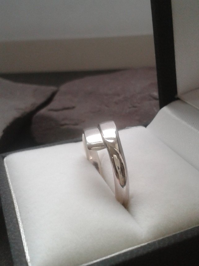 This overlapping forged silver ring is handmade. It is simple but an exceptionally stylish design. It has been crafted from 3 mm D shaped sterling silver wire. The overlapping ends have been forged into a smooth and beautiful flat shape. The forging is achieved through alternate heating and hammering of the ends and is all carried out by hand in my workshops in Lancashire.